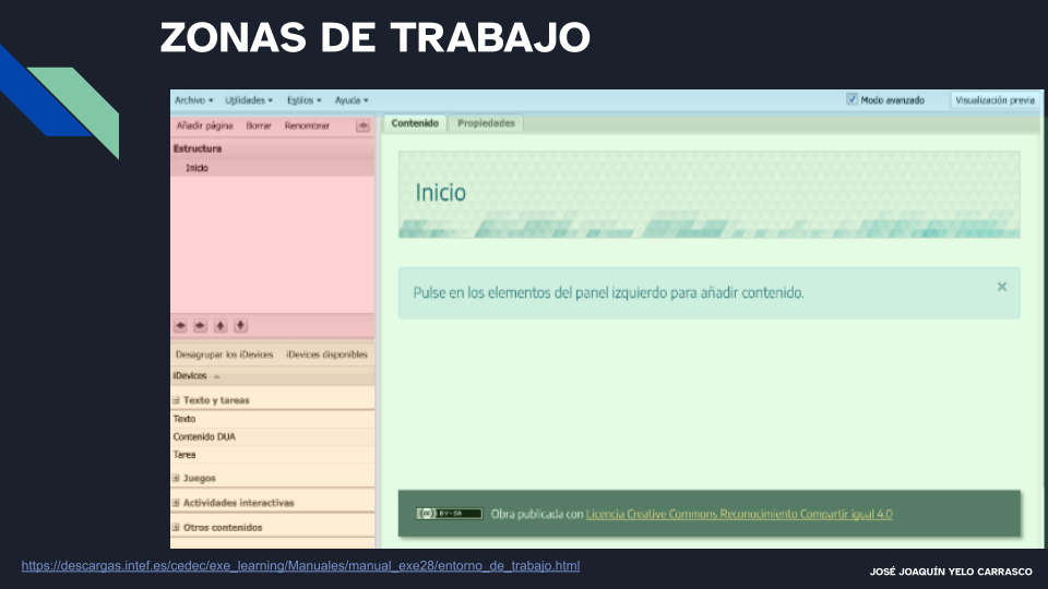 La pantalla de eXeLearning que se abre en el navegador, tiene 4 zonas, como puede verse en la imagen anterior.